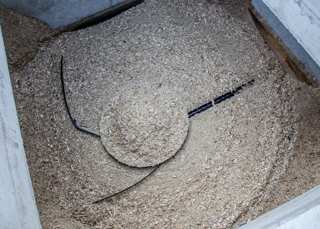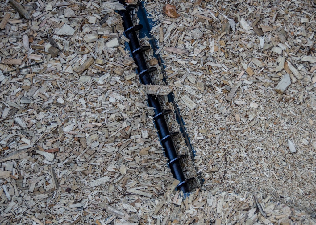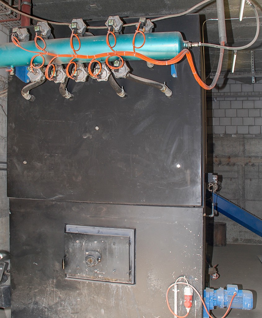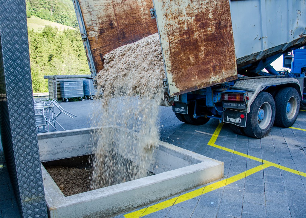 Unser Fernheizwerk hat eine Gesamtleistung von 1’000 kW. Die Anlage wird durch Holzschnitzel betrieben, welche wir selber mit unserem Solarstrom produzieren (siehe Solarkraftwerk).